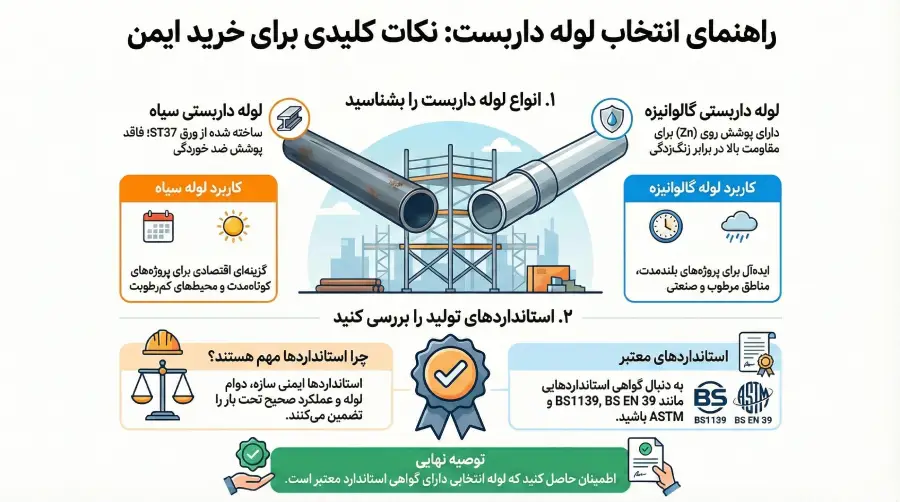 در فرآیند خرید لوله داربست فولادی، توجه به مجموعهای از معیارهای فنی و سازهای ضروری است. رعایت این نکات به خریدار کمک میکند تا انتخابی بهینه، ایمن و اقتصادی داشته باشد و از بروز هزینههای اضافی ناشی از انتخاب اشتباه جلوگیری شود. در این راهنمای تخصصی، مهمترین نکات مؤثر در انتخاب لوله داربستی را بررسی میکنیم.